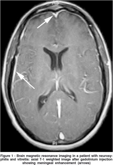 Rapid plasmin reagin - RPR (titer 1:1024) and fluorescent treponemal antibody absorption - FTA-ABS (4+ reactive) were both abnormal. Brain magnetic resonance imaging was significant for meningeal enhancement without focal abnormalities (Figure 1). Cerebral spinal fluid analysis was abnormal: 35 WBCs (100% lymphocytes), protein 57mg/ml, glucose 55mg/ml and positive VDRL (titer 1:4). Additionally, Huntington cytosine-adenosine-guanine (CAG) repeat genetic testing was normal and HIV testing was positive with a CD4 count of 242. Following treatment with intravenous penicillin, a prompt improvement of the vitreitis and chorea was observed.