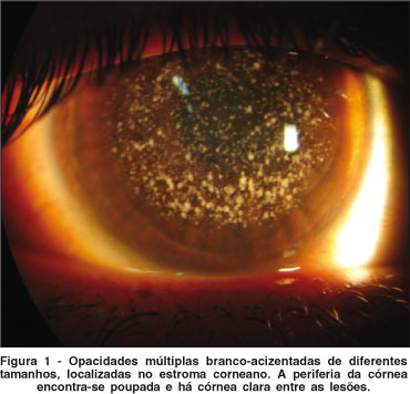 Ao exame oftalmológico, a acuidade visual era de 20/50 olho direito e 20/50 olho esquerdo e não melhorava com refração. À biomicroscopia, foram observadas opacidades em "floco de neve" em diferentes níveis do estroma corneano nos dois olhos e de forma simétrica. A córnea entre as lesões era clara e a periferia estava poupada (Figura 1). Tonometria de aplanação de 15 mmHg em ambos os olhos e fundoscopia dentro da normalidade.