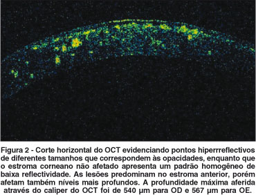 A avaliação pelo OCT revelou múltiplos pontos hiperreflectivos em diferentes níveis estromais, predominando no estroma anterior, porém acometendo também as camadas mais profundas. O espaço de baixa reflectividade entre eles corresponde às lamelas corneanas normais (Figura 2). A profundidade máxima das opacidades, medidas através do caliper do OCT foi de 540 µm para olho direito e 567 µm para olho esquerdo. Os achados foram compatíveis com o exame biomicroscópico e o Stratus OCT 3 mostrou-se capaz de fornecer imagens de alta resolução de cortes seriados da córnea.