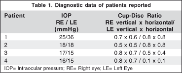 We performed refractometry and best corrected visual acuity with Snellen chart, slitlamp biomicroscopy (Haag-Streit AG, Bern, Switzerland), applanation tonometry (Goldmann; Haag-Streit AG, Liebefeld, Switzerland), gonioscopy, automated perimetry (Humphrey Instruments Inc, H750, Dublin, California/ USA), water drinking test(3-4) and dilated funduscopy to evaluate optic discs. All patients presented optic discs with characteristic signs associated with glaucoma as localized loss of neuroretinal rim tissue, defects of the nerve fiber layer, cup/disc asymmetry and others.