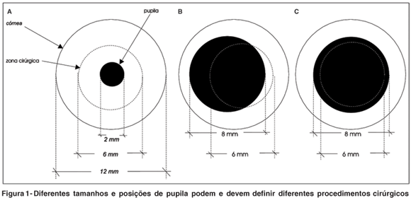 Na figura 1 temos três casos hipotéticos para um mesmo olho: (A) pupila para nível fotópico de luz (> 4 LUX). Na iluminação fotópica a pupila adquire forma com diâmetros bem pequenos (~2 mm) e, portanto é bem menor que a região operada pelo laser (normalmente de 6 mm). Para este caso a visão será boa mesmo que o centro da região operada não coincida exatamente com o centro da pupila, pois aqui somente raios paraxiais estão entrando no olho e a imagem na retina conseqüentemente só depende do poder óptico da região central da córnea; (B) para níveis de iluminação escotópica e mesópica (< 4 LUX) os diâmetros pupilares podem chegar a 8 mm, portanto além da região operada. Se, para estes casos a cirurgia for descentrada com relação à córnea e o centro da pupila não coincidir com o centro da córnea, regiões de entrada de luz não corrigidas podem influenciar na visão noturna do paciente (por exemplo, quando estiver dirigindo à noite); (C) mesmo para centros que coincidam, a informação do diâmetro pupilar pode indicar ao médico também a necessidade em aumentar a região cirúrgica, quando possível. A maioria dos lasers disponíveis hoje comercialmente não permite a mudança da área de cirurgia, pois isto é calculado automaticamente pelo "software", mas acreditamos que no futuro isso será possível, pois é mais um parâmetro para otimizar a cirurgia personalizada.