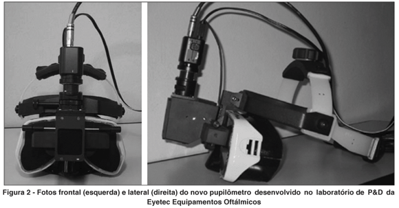 Para realizar vídeos digitais da pupila adaptamos um sistema óptico no capacete de um oftalmoscópio desenvolvido pela empresa Eyetec Equipamentos Oftálmicos (http://www.eyetec.com.br/ohd.php). Desta maneira o paciente, ao invés de olhar através de um sistema fixo de bancada, pode então movimentar a cabeça e ficar em posição ereta, dando maior conforto para exames mais longos. O sistema todo, já montado, pode ser visto na figura 2.