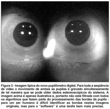 No sistema óptico, além das lentes de aumento, há um LED infravermelho e um LED visível para iluminação da pupila e a intensidade destes LEDs pode ser controlada externamente. Há também no sistema óptico um LED visível que funciona como objeto de uma lente que projeta sua imagem em um plano virtual localizada há 6 metros do olho do paciente. Desta maneira o paciente pode fixar o olhar durante o exame e manter o cristalino acomodado para o infinito (na realidade, desacomodado). A parte eletrônica controla a intensidade de luz usando a porta serial do PC onde podemos também digitalizar imagens da pupila bastante nítidas. A captura das imagens é realizada por uma placa "frame grabber" comercial instalada em um PC (Pentium III, 800 MHz). A parte do "software" que controla a intensidade de luz foi desenvolvida em Pascal (Delphi) (www.borland.com) e a parte que realiza o processamento dos vídeos foi desenvolvida em Matlab (www.mathworks.com). Pela interface gráfica do "software" o usuário pode escolher até dez níveis diferentes de iluminação (de mesópico a fotópico) e determinar os intervalos entre cada mudança de intensidade de luz. Portanto, é o usuário que determina o tempo total de exposição e duração do exame. A máscara evita que a luz vinda do ambiente influencie no processo do exame. Na figura 3, mostramos um dos quadros de uma seqüência de vídeo sem magnificação que foi digitalizado para um voluntário (sexo masculino, 31 anos).