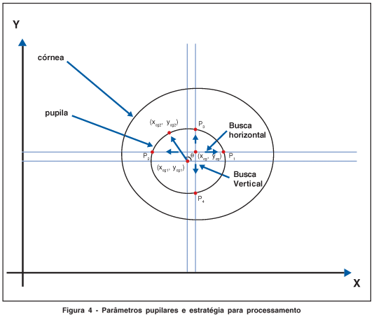 O algoritmo inicia a busca pelo centro da imagem (xcg1, ycg1) e percorre em ambas as direções (vertical e horizontal) em ambos sentidos até encontrar pontos de borda (P1...P4). A mediatriz de P1 P2 e P3 P4 fornece as coordenadas do novo ponto de busca (xcg2, ycg2). A partir deste novo ponto o algoritmo inicia a busca pelos vários pontos que caracterizam a borda da pupila, ou seja, a região de transição entre o diafragma da íris (que é a pupila) e a parte colorida da íris. Esta busca é realizada em coordenadas polares, para o ângulo azimutal (θ) variando de 1 a 360º, em intervalos de 1º e para a distância radial (ρ) variando de zero até o ponto de transição pupila-íris. O centro geométrico da pupila é então determinado como sendo,