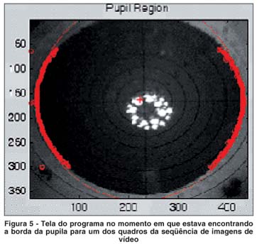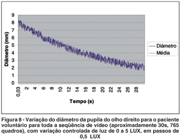 Como mencionado anteriormente, realizamos apenas medidas preliminares neste trabalho e apresentamos aqui, por motivos didáticos, apenas os resultados para um dos olhos, embora o instrumento possa ser utilizado para medidas estereoscópicas. Uma seqüência de 30 segundos de vídeo foi capturada para um paciente voluntário (sexo masculino, 31 anos) com intensidade de iluminação variando de 0 a 5 LUX. O arquivo de vídeo foi então inserido em nosso "software" e para todos os quadros foram determinados o centro geométrico (coordenadas X e Y) e diâmetro da pupila. Na figura 5 mostramos uma das imagens do voluntário sendo processada pelo "software" e na figura 6 mostramos um gráfico com a seqüência de dados.