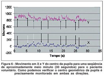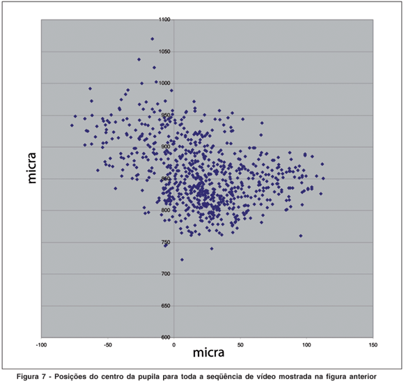 Como podemos ver pela figura 7 os movimentos da pupila na direção vertical (Y) variaram entre aproximadamente 750 e 1050 microns sendo que na direção horizontal (X) a variação foi aproximadamente entre -50 e 100 microns. O gráfico mostra esta variação de maneira mais clara, pois nele podemos ver todas as posições do centro da pupila ao longo de todo o processo de medida.