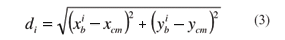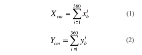 onde (xb, yb) são as coordenadas dos pontos de borda. Depois de determinado o centro geométrico (ou centro de "massa") determinamos o raio médio da circunferência que melhor aproxima os pontos de borda calculando a média de 360 distâncias