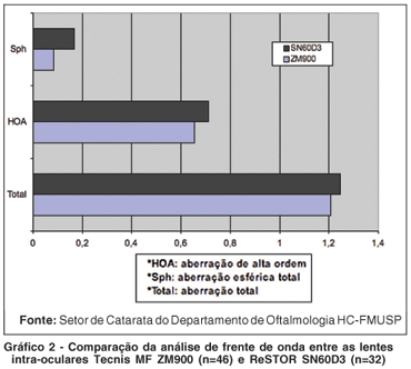 Com relação às aberrações avaliadas, houve superioridade nos valores absolutos a favor da LIO Tecnis ZM900 sobre a SN60D3, quando se analisou as aberrações totais e esféricas; entretanto, essa vantagem não foi estatisticamente significante neste estudo. Outro trabalho, com menor amostra, demonstrou redução significante das aberrações esféricas especialmente no grupo da LIO Tecnis ZM900(30).