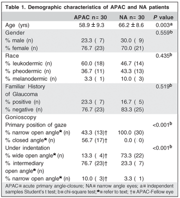 Table 1 shows the demographic features of the 60 studied subjects. We assessed 30 fellow APAC eyes and 30 NA eyes. Twenty-one (70%) patients of the NA group had the diagnosis of POAG with narrow angle and 9 (30%) suspect characteristics. NA patients were older than APAC patients (P=0.003), however, no difference was found between the two groups when gender (P=0.559), race (P=0.435) and history of glaucoma (P=0.519) were compared. The statistical difference of gonioscopic classification was evident between groups (P<0.001).