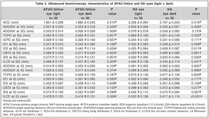 MÉTODOS: Olhos contralaterais de 30 pacientes com FAPA unilateral e olhos de 30 pacientes com AE foram avaliados através da biomicroscopia ultra-sônica (BUS) no claro e escuro. Parâmetros da BUS como a profundidade central de câmara anterior (PCA), distância da abertura angular a 250 µm/500 µm do esporão escleral (AOD250/AOD500), distância entre o processo ciliar e o trabeculado (TCPD) e distância do contato iris-cristalino (ILCD) foram medidos nos quadrantes superior (QS) e inferior (QI).