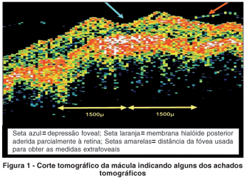 Nas imagens em que a depressão foveal estava ausente, as medidas foveais foram realizadas na região mais elevada da imagem e as medidas extrafoveais foram realizadas em um raio de 1500 µ desse ápice, de modo análogo ao mencionado no parágrafo anterior. O quadro 1 mostra os parâmetros mensurados, enquanto que o quadro 2 mostra as características tomográficas observadas à OCT ao longo do estudo.