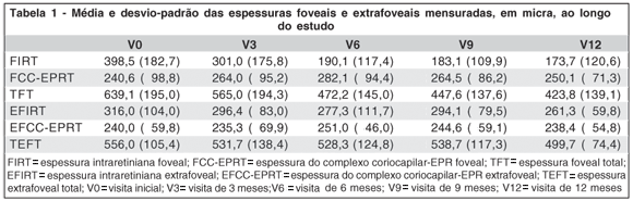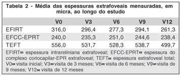 A tabela 1 sintetiza os valores encontrados para a média das espessuras extrafoveais total ao longo do estudo.