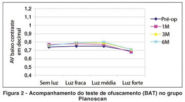 A análise da figura 2 permite observar que os valores da acuidade visual de baixo contraste, no grupo Planoscan, foram muito próximos no período pós-operatório em relação ao pré-operatório para todas as condições de ofuscamento testadas. A menor diferença entre a acuidade visual do pré-operatório em relação ao pós-operatório, se verificou na condição de ofuscamento com luz forte. No período de um mês, a média da acuidade visual de baixo contraste foi inferior à média do pré-operatório. Nos períodos de três e seis meses, os valores foram equivalentes aos do pré-operatório.