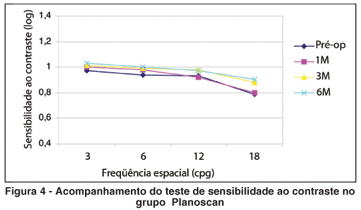 A análise da figura 4 permite observar que, no grupo Planoscan, os valores da sensibilidade ao contraste, no período pré-operatório e pós-operatório, foram próximos. A média da sensibilidade ao contraste para as freqüências espaciais de 12 e 18 ciclos/graus, no período de um mês, foi igual à média do pré-operatório, com melhora nos períodos de três e seis meses.