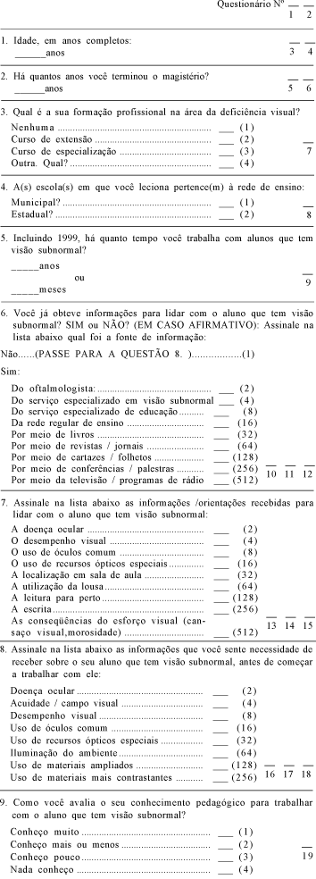Mediante estudo exploratório realizado com professores do ensino fundamental de escolas estaduais de municípios próximos a Campinas, elaborou-se questionário auto-aplicável como instrumento de coleta de dados, que foi aplicado aos professores em dezembro de 1999, nas escolas em que atuam com os alunos portadores de visão subnormal6.