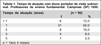 É importante salientar que o tempo de atuação do professor com alunos portadores de visão subnormal - média de 1 ano e 4 meses -, sugere período restrito de experiência que, aliado à falta de formação e de informação pode conduzir a uma atuação insatisfatória no que se refere à inclusão. Este curto período de experiência pode ser justificado pela alta rotatividade dos professores não efetivos no sistema regular de ensino, ou por conta dos poucos alunos deficientes visuais incluídos.