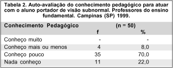 Na auto-avaliação de conhecimentos pedagógicos, a maioria dos professores declarou deter pouco (70,0%) ou nenhum conhecimento (22,0%) a respeito de como atuar com alunos que tem visão subnormal (Tabela 2).
