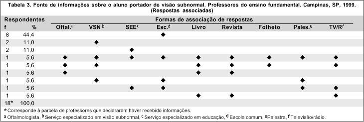 O serviço especializado em visão subnormal associado a outras fontes, forneceu orientações a 5 (28,0%) professores, enquanto que 3 (16,0%) receberam informações do oftalmologista com associação de outras fontes (Tabela 3).