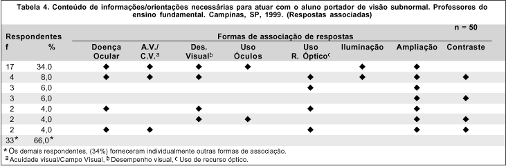 Todos os professores apontaram conteúdos de informações/orientações que desejam receber sobre o aluno portador de visão subnormal (Tabela 4). A orientação mais solicitada refere-se à ampliação dos materiais utilizados em sala de aula (66,0%), seguida daquela que diz respeito ao desempenho visual (50,0%) e informações sobre a doença ocular (50,0%). Outras informações relacionadas à acuidade visual/campo visual (46,0%) destacam-se na opinião dos professores. A orientação menos solicitada refere-se à utilização dos contrastes (22,0%).