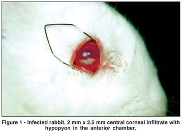 We induced Fusarium solani keratitis in the right eye of 24 adult male New Zealand rabbits (1.4-2.6 kg in weight). Prior to the inoculation, the eyes received 5 daily subconjunctival injections of 0.2 mL 0.4% dexamethasone sodium phosphate, under topical anesthesia (proparacaine). Inoculation was performed on the last day of this preparation.
