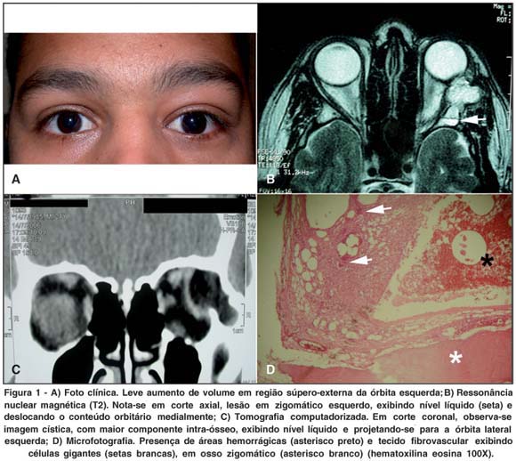 O estudo anátomo-patológico revelou tecido ósseo com presença de múltiplos espaços císticos, preenchidos por hemácias, sem cobertura endotelial. Separando os cistos, existiam septos contendo fibroblastos alongados e células gigantes multinucleadas (Figura 1D). O diagnóstico final foi de COA orbitário. O paciente evoluiu bem, não apresentando sinais de recidiva no controle radiológico após seis meses de acompanhamento.