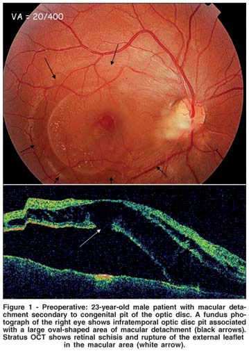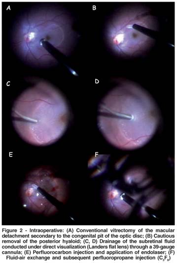 There is controversy about the treatment of retinal detachment associated with congenital pit of the optic disc. Treatment modalities such as external laser therapy alone(13), intravitreous gas injection alone(14), laser therapy combined with gas(15), vitrectomy associated with gas tamponade, with or without additional laser treatment(16-17) and scleral buckling(18) have been described in the literature. In this particular case, the best choice was posterior vitrectomy via pars plana, with perfluorocarbon, endophotocoagulation and gas tamponade (C3F8); however, active internal drainage of the subretinal fluid can lead to successful reattachment of the macula and improvement of central vision. Subretinal fluid is eventually absorbed by the retinal pigment epithelium (RPE) and eventually complete apposition of the neurosensory retina with the RPE is achieved. Some retinal detachments are associated with a high volume of subretinal fluid, and its removal can be an important step for the successful surgical procedure. Several factors related to retinal detachment associated with congenital pit of the optic disc are noteworthy. First, good visual recovery is possible even months after the onset of maculopathy(19), and serous macular retinal detachment responds well to early vitrectomy(20).