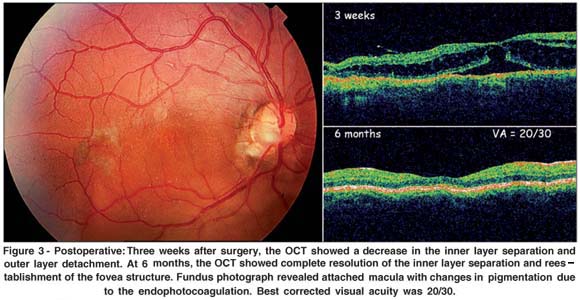 The present case showed reestablishment of the anatomic macular structure and significant functional improvement after 6 months of the surgery. OCT helped in monitoring the macular elevation that resolved gradually, with a progressive increase in visual acuity coinciding with the reabsorption of subretinal fluid. The limited recovery of visual function is probably related to its longstanding nature, and to the deposition of exudate on the posterior retinal surface and marked alteration in macular function characteristic of these detachments.