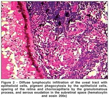 Histopathology revealed diffuse lymphocytic infiltration of the uveal tract with epithelioid cell nests, pigment phagocytosis by the epithelioid cells, absence of necrosis, and sparing of the retina and choriocapillaris by the granulomatous process. The inflammatory process also involved the scleral channels. The retina was totally detached with exudation in the subretinal space (Figure 2). The retina structures were disrupted with gliosis and atrophic changes. The anterior segment of the eye was totally disorganized in its normal anatomy and revealed a corneal perforation.