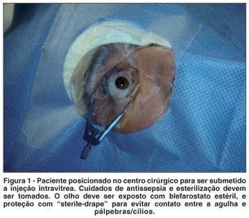 Além das medidas para a eliminação das bactérias nativas dos pacientes, cuidados com a desinfecção das mãos, a preparação do campo operatório, e a utilização de seringas e cânulas esterilizadas são recomendadas(l2,l8-l9). Preferencialmente, o cirurgião deverá realizar a escovação tradicional e utilizar luvas estéreis para a aplicação da injeção intravítrea, assim como deverá usar a máscara para a cobertura das vias aéreas. O olho deve ser exposto com blefarostato estéril. A proteção com "sterile-drape" deve ser utilizada para evitar o contato entre a agulha e as pálpebras/cílios(l2). Ao menos uma gota de iodo-povidona 5% deve ser aplicada, após o posicionamento do blefarostato e imediatamente antes da penetração da agulha (Figura l).