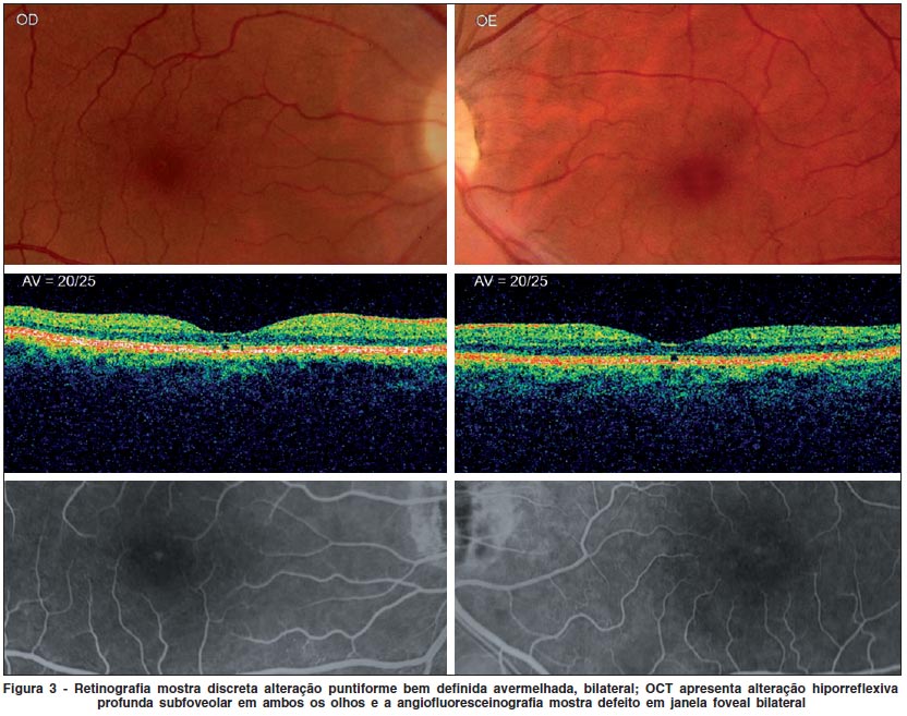 Na tomografia de coerência óptica, todos os olhos apresentaram uma lesão pequena (<100 micra) e hiporrefletível na região foveal, que acometia as camadas mais profundas da retina, rompendo a linha de alta refletividade externa correspondente à junção dos segmentos interno e externo dos fotorreceptores Figuras 1, 2 e 3). Não se detectaram alterações da junção hialóide posterior - membrana limitante interna - nos pacientes examinados.