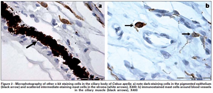 MÉTODOS: Oito olhos de quatro macacos do novo mundo (Cebus apella) foram estudados. Após bloqueio da peroxidase endógena e de ligação protéica não específica, os tecidos receberam aplicação de anticorpos de camundongos antioncoproteína c-kit humana (1:100). A reação antígeno-anticorpo foi verificada através da aplicação do complexo avidina-biotinilada-peroxidase em cada lâmina.