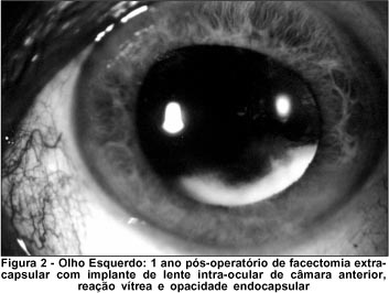J. S. B., 56 anos, masculino, encaminhado para nossa avaliação no PO de facectomia extracapsular com queixa de embaçamento em ambos os olhos (AO) há aproximadamente 1 ano. Relatava que 4 meses após a primeira cirurgia do OE, teve o diagnóstico de inflamação intra-ocular que, após a administração de corticosteróide tópico, evoluiu com melhora seguida pela recorrência dos sintomas após a redução da medicação. Neste mesmo olho verificou-se a opacificação da cápsula posterior, sendo realizada a capsulotomia com YAG Laser. Sete meses após a cirurgia do OE foi submetido a facectomia extracapsular do OD. O procedimento cirúrgico foi feito sem intercorrências pela técnica extracapsular e após o quarto mês de cirurgia, o OD também apresentava processo inflamatório, passando a receber corticosteróide tópico agora em AO, apesar do tratamento instituído a inflamação progrediu. O paciente não apresentou lesões no fundo do olho ou aumento da pressão intra-ocular, sendo portanto realizadas 2 injeções de Depomedrol® no OE com intervalo de 2 meses. Um ano após a cirurgia do primeiro olho e sete meses após a cirurgia do segundo olho o paciente foi examinado por nossa equipe e verificamos reação de CA em AO intensa, vítreo no OE e opacidades brancas endocapsulares em ambos os olhos (Figuras 1 e 2).