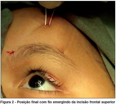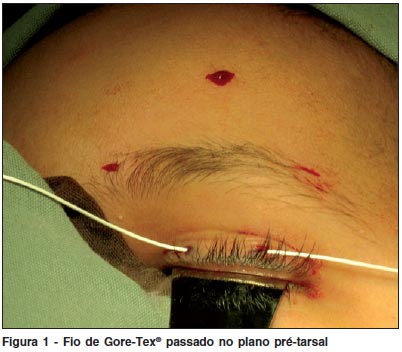 As incisões são feitas com bisturi lâmina nº 15 e aprofundadas até o tarso (2 inferiores) e periósteo (3 superiores). O fio de Gore-Tex® Modelo CV3, 6.0 (W.L. Gore & Associates Inc, Flagstaff, AZ, EUA) é passado no plano submuscular utilizando-se a agulha de Wright. A figura 1 mostra o fio passado na região pré-tarsal. As pontas do fio são exteriorizadas pela incisão superior e tracionadas até que a pálpebra fique na posição desejada levemente hipercorrigida (Figura 2). É realizado o anodamento do fio e as incisões de pele são suturadas com pontos simples de fio seda 6-0.