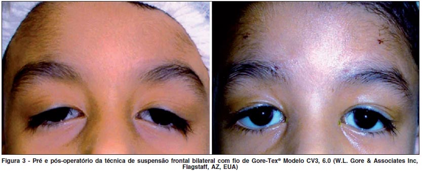 No período de fevereiro de 2003 a abril de 2007, foram realizadas cirurgias de suspensão ao músculo frontal em 23 pacientes, sendo 18 (78,26%) do sexo masculino e 15 (21,74%) do sexo feminino. A idade dos pacientes variou de 4 a 55 anos (média 16,43) e o seguimento do pós-operatório variou de 3 a 36 meses (média 15,87). Foram realizadas 36 cirurgias, sendo bilateral em 13 (56,52%) pacientes e unilateral em 10 (43,48%) pacientes, sendo somente no olho direito em 4 (17,39%) pacientes, e no olho esquerdo em 6 (26,08%) pacientes. A figura 3 mostra o resultado da técnica da suspensão frontal com fio de PTFEe (Gore-Tex® Modelo CV3, 6.0 W.L. Gore & Associates Inc, Flagstaff, AZ, EUA) num paciente com ptose congênita bilateral grave.