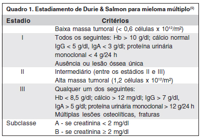 O estadiamento clínico tem importante valor prognóstico e terapêutico em pacientes com MM. Em casos de MM assintomático não existem ainda evidências de que a instituição de tratamento precoce prolongue a taxa de sobrevida(8). Nos casos de MM ativo e sintomático, dados recentes sugerem que novas associações de drogas possam ter resultados superiores aos do esquema clássico (vincristina, adriamicina e dexametasona), entre elas: talidomida com dexametasona e lenalidomida com dexametasona(8). Nossa paciente, classificada no estadio III B - segundo método proposto por Durie & Salmon(9) - (Quadro 1), foi submetida à quimioterapia com o esquema clássico; porém, respondeu de forma insatisfatória, evoluindo a óbito após o segundo ciclo de quimioterapia por insuficiência renal. Infecções e insuficiência renal são as principais causas de morte em pacientes com MM.