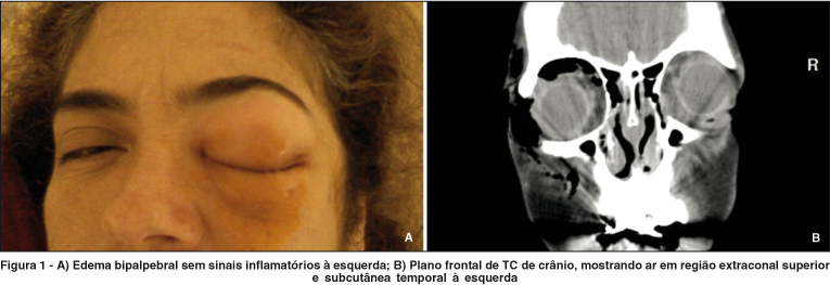 Após realização de tomografia computadorizada de órbitas, observou-se enfisema orbitário à esquerda, possivelmente secundário ao asseio vigoroso do nariz. O exame mostrava presença significativa de ar na região superolateral da órbita esquerda (Figura 1B), não foi possível identificar a possível descontinuidade da lâmina papirácea neste lado.