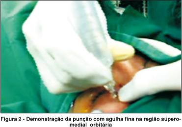 Devido à hipótese diagnóstica de enfisema orbitário com sinais de compressão do nervo óptico e risco de comprometimento visual permanente, foi realizada uma punção orbital com agulha fina, após consentimento da paciente. A punção foi realizada sob anestesia local e condições assépticas, introduzindo-se uma agulha 24 gauge (KDL, São Paulo), montada em uma seringa de 10 ml sem êmbolo e com solução salina em seu interior, foi inserida na região superomedial orbitária, próximo à incisura supraorbital paralela ao teto, em manobra similar à anestesia peribulbar (Figura 2). A região da punção foi direcionada pela tomografia computadorizada, que revelou maior quantidade de ar na região extraconal superior. Com a punção, houve erupção de bolhas para dentro da seringa, evidenciando o sucesso do procedimento, inclusive com redução imediata do volume das pálpebras. No dia seguinte, a paciente apresentava melhora significativa do edema palpebral, motilidade ocular preservada, acuidade visual de 1,0, pressão intraocular de 13 mmHg e biomicroscopia anterior e fundoscopia dentro da normalidade. Nenhuma intervenção adicional foi necessária.