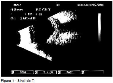 No exame de ecografia a alteração mais observada foi o espessamento esclerocoroidiano (espessamento da parede escleral posterior), ocorrendo em 18 pacientes (78,2%). O clássico, mas não patognomônico, sinal do T (fluído no interior da cápsula de Tenon e na bainha do nervo óptico determinando uma letra T escura na ecografia. A barra horizontal do T é formada pela ecoluscência do fluído na cápsula de tenon e a barra vertical pela ecoluscência do disco óptico de aspecto dilatado) foi detectado em apenas 7 casos (30,4%) (Figura 1).