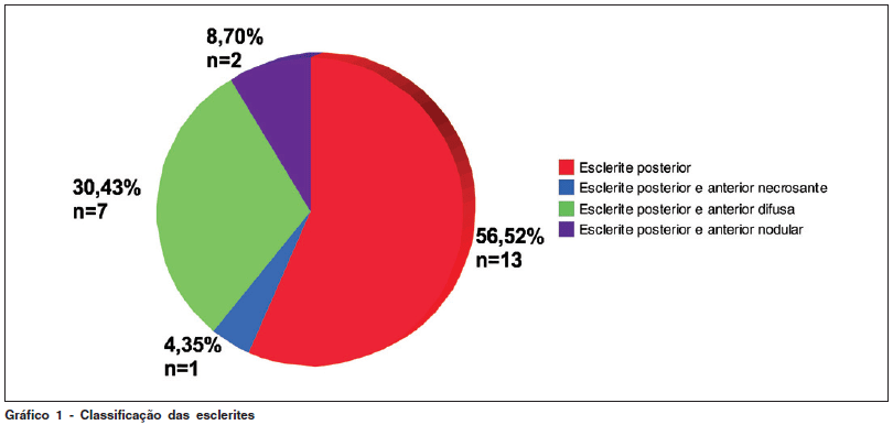 A esclerite posterior ocorreu sem associação com esclerite anterior, no momento da apresentação, em 13 pacientes (56,5%) e associada à esclerite anterior, em 10 (43,5%) (30,4% com esclerite anterior difusa, 8,7% com esclerite anterior nodular, 4,3% com esclerite anterior necrosante) (Gráfico 1). Nenhum dos 13 pacientes que apresentou esclerite posterior isolada evoluiu, durante o período de acompanhamento, com esclerite anterior.