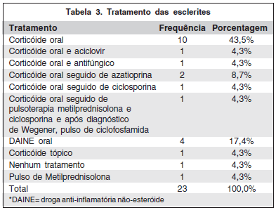 Foi necessária a pulsoterapia venosa com metilprednisolona, como tratamento inicial (1 g/dia por três dias consecutivos), em um paciente que além da esclerite apresentava quadro de pseudotumor inflamatório. O paciente com granulomatose de Wegener, antes de receber o seu diagnóstico, iniciou tratamento com corticosteróide oral (1 mg/kg/dia), seguido de pulsoterapia venosa com metilprednisolona (1 g/dia por três dias consecutivos) e ciclosporina oral (4 m/kg/dia) (apresentava quadro bilateral e grave de esclerite anterior e posterior). Houve boa resposta com melhora do quadro ocular, mas após o diagnóstico, o seu tratamento foi modificado pela reumatologia, para pulsoterapia venosa com ciclofosfamida devido ao aparecimento de quadro pulmonar.