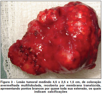 O paciente foi submetido a exérese sob anestesia local e a reconstituição se deu por aproximação direta das bordas de pele não acometida com mononylon 6.0 (Figura 2). O tumor apresentava 4,5 x 2,5 x 1,5 cm, havendo lobulações (facetas) e pontos esbranquiçados e endurecidos, sugerindo calcificações por toda sua extensão (Figura 3). O exame anatomopatológico confirmou o diagnóstico anterior, não evidenciando sinais de malignidade.