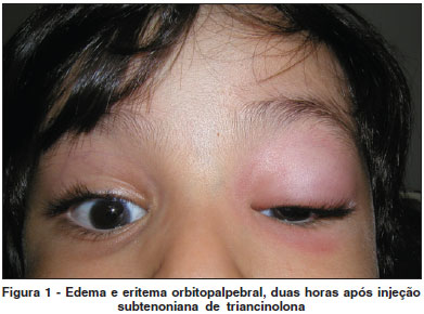 No caso descrito, a reação observada sugere tratar-se de reação alérgica a algum componente do líquido injetado, com liberação de substâncias vasoativas responsáveis pelo edema e eritema. É usual que ocorra refluxo do líquido injetado para a região subtenoniana anterior ou subconjuntival. Logo após a injeção não se observou nenhum sinal de refluxo ou reação conjuntival no local da injeção. A evolução favorável permitiu classificar a complicação como leve. São relatados na literatura, como complicações menores associadas à injeção subtenoniana de corticosteróide, dor, edema palpebral, sensação de queimação, cefaléia e blefaroptose, geralmente transitórios(4-6). Outros autores(7) relatam os casos de três crianças, entre 7 e 11 anos de idade, portadoras de uveíte intermediária, nas quais observaram elevação da pressão ocular após injeção subtenoniana profunda de triancinolona. Esta é uma complicação tardia, relacionada aos efeitos da droga injetada.