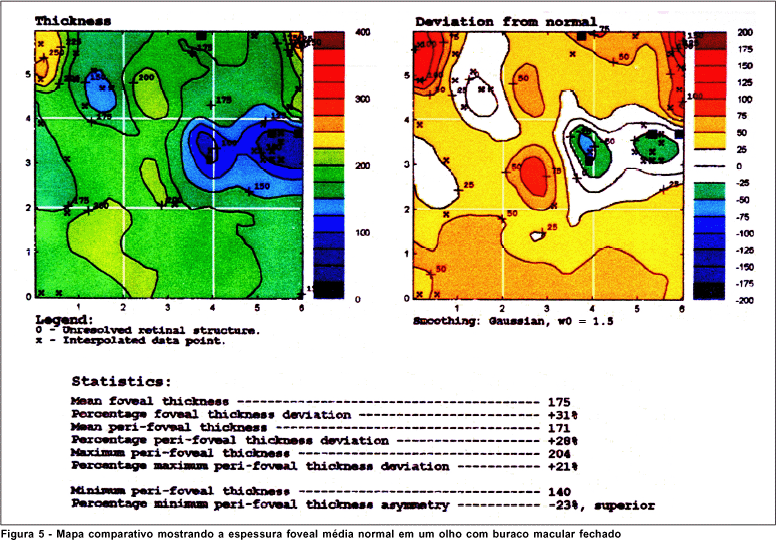 Em olhos com buraco macular existe uma redução da espessura retiniana na região foveal. Neste estudo, entretanto, utilizando-se a análise dos mapas comparativos, não se observou redução da espessura foveal média, como seria esperado, em nenhum dos seis olhos com buraco macular não operado. Observou-se, pelo contrário, aumento da espessura foveal média em todos os seis olhos. Que tenhamos conhecimento, este é o primeiro relato da literatura que mostra aumento da espessura foveal, pelo mapa comparativo do RTA. Acreditamos que esse fato seja decorrente da extrema dificuldade de fixação dos olhos portadores dessa patologia durante a realização do exame. Outra explicação é inerente a limitações próprias do aparelho. Os mapas topográficos são realizados pelo programa do computador a partir da identificação de duas interfaces, vítreo-retina e retina-epitélio pigmentar da retina, segundo informações do próprio fabricante. A ausência de uma dessas interfaces determina falhas no programa, o que pode explicar esse aumento da espessura foveal medida pelo mapa topográfico, em olhos com buraco macular.