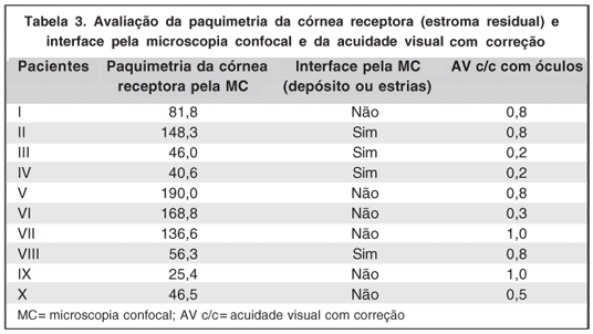 Em uma publicação sobre CLAP, foi verificado pela MC paquimetria média da córnea receptora de 64,2 ± 67,0 µm (variação de 45 a 72 µm) no15º dia de pós-operatório e não houve diferença significante ao longo do seguimento de 12 meses(21), atingindo AV c/c final logarítmica (logMAR) de 0,104 ± 0,068. Foi também constatada correlação negativa entre a hiperrefletividade da interface e a melhor AV c/c, sendo que a microscopia confocal mostrou-se precisa na avaliação das camadas corneanas e da interface. Neste mesmo estudo, não foram feitas as medidas das paquimetrias corneanas total nem do botão doado. Não foram encontradas na literatura referências quanto às medidas das paquimetrias corneanas total nem do botão doado em pós-operatório de CLAP.