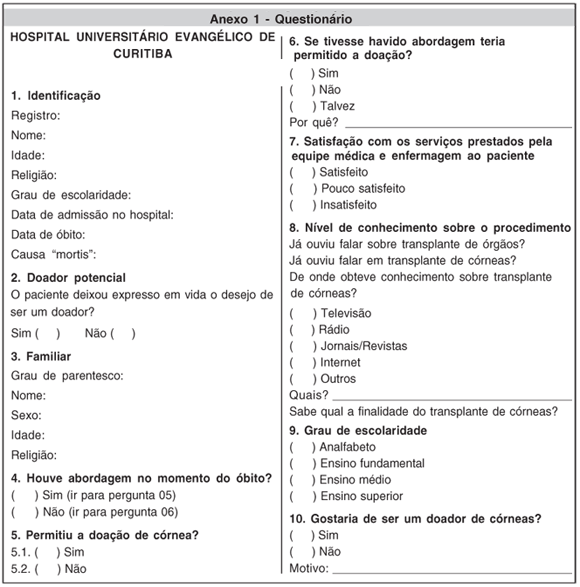 O objetivo do presente estudo foi identificar as principais variáveis envolvidas na não-doação de córneas entre potenciais doadores de um hospital universitário de Curitiba.