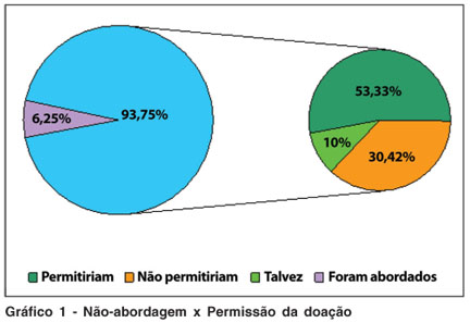 Dos 64 familiares entrevistados, 60 não foram entrevistados em relação à doação no momento do óbito. Destes, 32 a teriam permitido se tivessem sido entrevistados; 6 talvez a tivessem autorizado, dependendo das circunstâncias e 22 não a teriam permitido (Gráfico 1).