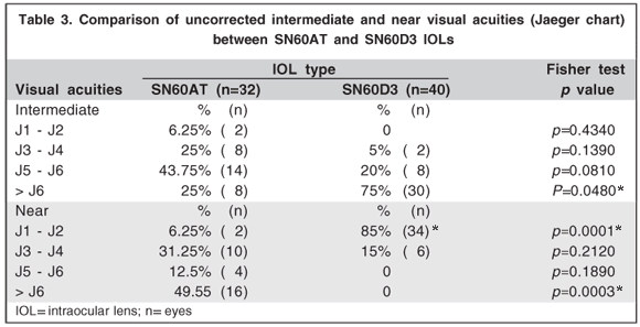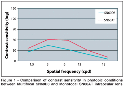 RESULTS: Values for total and spherical aberrations in the multifocal group were statistically lower than in the monofocal group. In the monofocal group, 75% achieved uncorrected intermediate visual acuities between Jaeger 1 and 6. In the multifocal group, 75% of the eyes achieved more than Jaeger 6. At least 87.5% of the multifocal group and 6.3% of the monofocal group achieved monocular uncorrected near acuity of 20/30 (J2, N5) or better. And 90.0% of the eyes in the multifocal group and 37.5% in the monofocal group achieved an uncorrected near acuity of 20/40 (J3, N6) or better. The mean spherical error was 0.11 D in the multifocal group and -0.18 D in the monofocal group (p=0.0379). The SN60D3 group compared to SN60AT group had low contrast sensitivity (log units) with statistically significant differences in 6.0 cpd in photopic conditions (p=0.014) and the SN60D3 group compared to SN60AT group had higher contrast sensitivity (log units) under mesopic conditions (p=0.044).
