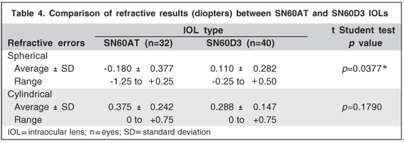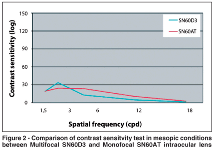 According with this study and previous published reviews, the monocular contrast sensitivity at photopic and mesopic conditions with the SN60AT IOLs was higher than the SA60D3(17,30). Under mesopic conditions contrast sensitivity showed lower values when compared to photopic conditions. Other study showed lower contrast sensitivity under mesopic conditions in multifocal IOLs with refractive technology(28). The difference between both IOLs was higher in photopic conditions, probably because the mesopic condition shows lower values than the photopic condition.