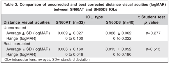 Postoperative wavefront analysis is shown in table 1. There were no significant differences in mean root-mean-square values of higher-order aberration, total coma, trefoil and tetrafoil between both groups. The mean values for total aberrations (TOTAL; p=0.015) and total spherical aberrations (TSA; p=0.001) in the SN60D3 multifocal group were statistically lower when compared to those for the SN60AT monofocal group.