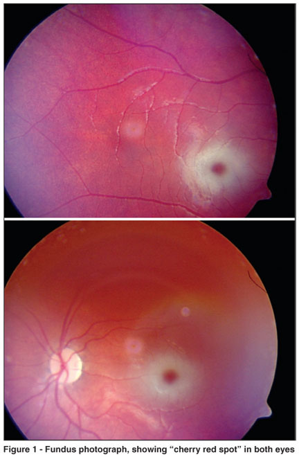 In the hospital initial exam the child had fever, rhonchi on chest auscultation and marasmus-like secondary protein-energy malnutrition. The neurological examination revealed psychomotor retardation, horizontal and bilateral nistagmus, muscle weakness, generalized hyperreflexia, clumsiness, and presence of Babinski and Moro signal. The ophthalmoscopic examination was very difficult due to the nystagmus, and showed chalk-white macular areas with a "cherry red spot" in the center of both eyes (Figure 1).